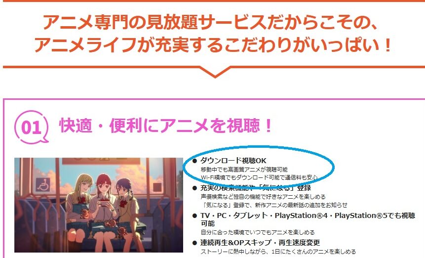 - オフライン視聴: ダウンロード機能を使って、インターネット接続なしでも視聴できます。